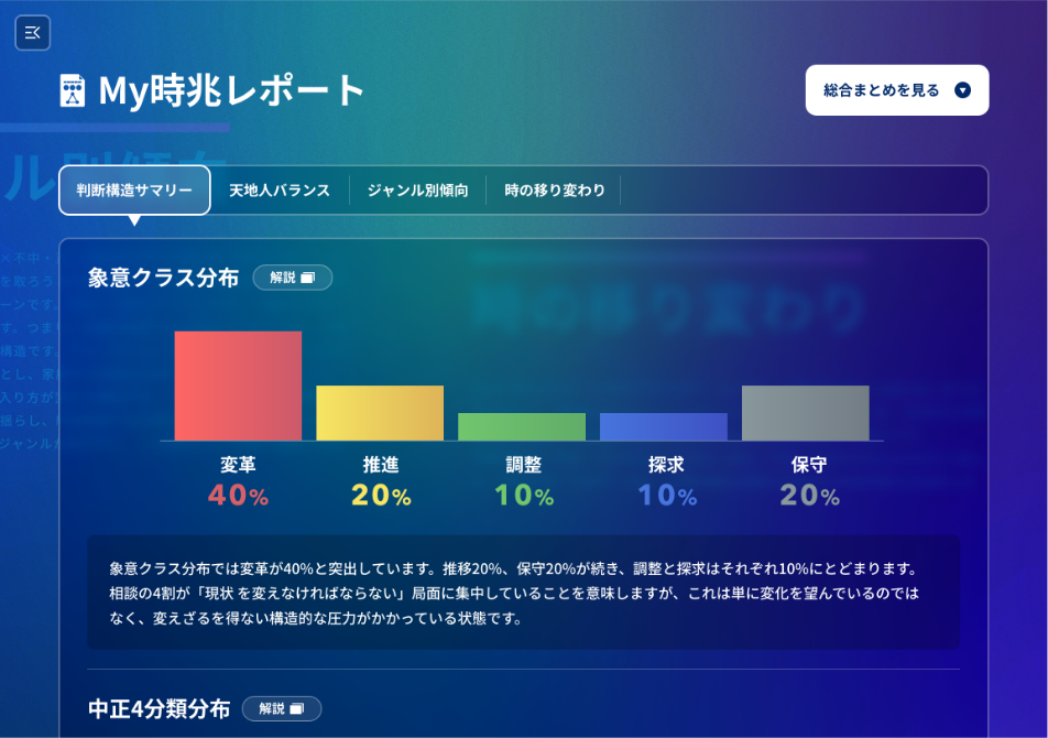 それが分かれば、動き方は自然と絞られます。易経の変化論理をAIで再構成し、客観的な現在地と次の一手を示しながら、相談を重ねるほど自分の判断力が育つ意思決定システムです。