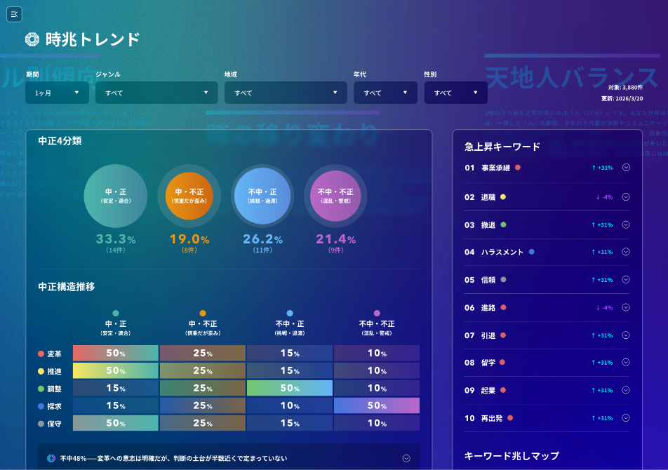 経営から恋愛まで。判断に迷うすべての局面が、時兆の対象です。
